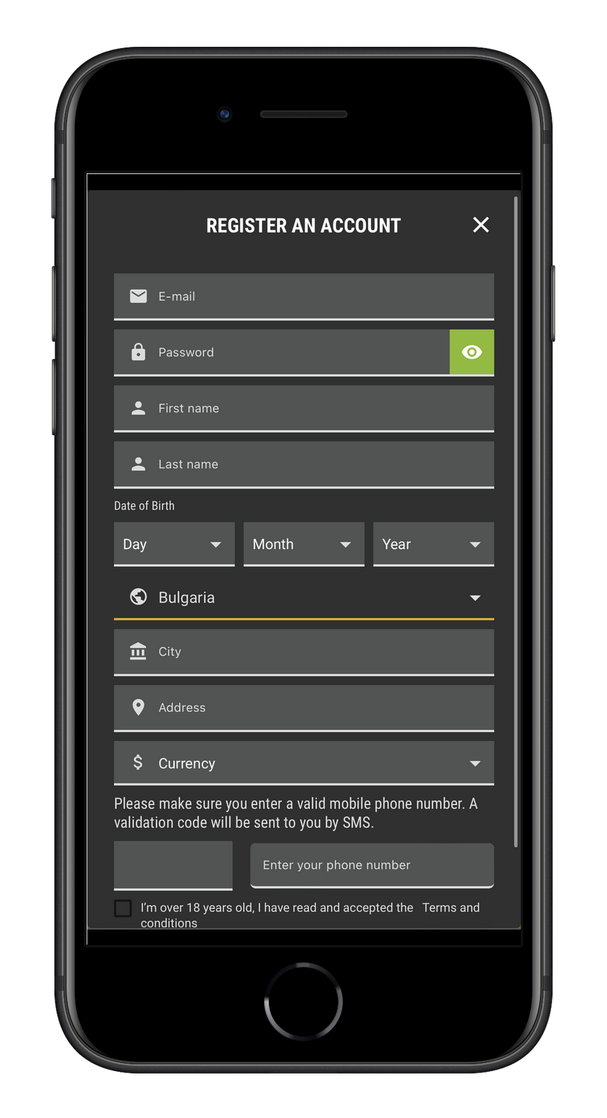 You just need to confirm your agreement with the rules of the online club and click Create Account. Then, a code will be sent to you via SMS to the specified number, which must be entered in 10 seconds.